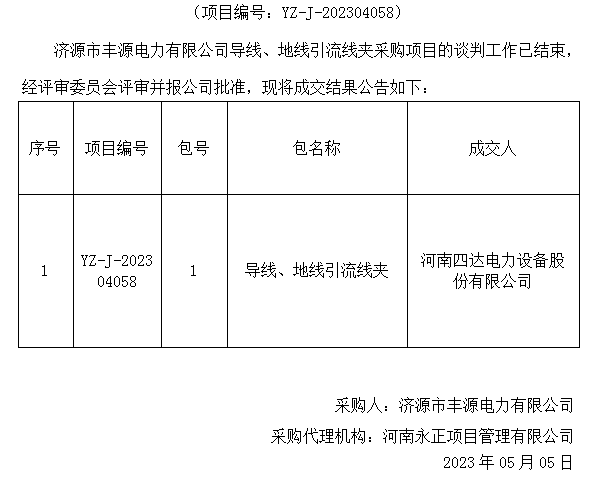 济源市丰源电力有限公司导线、地线引流线夹采购项目成交结果公告